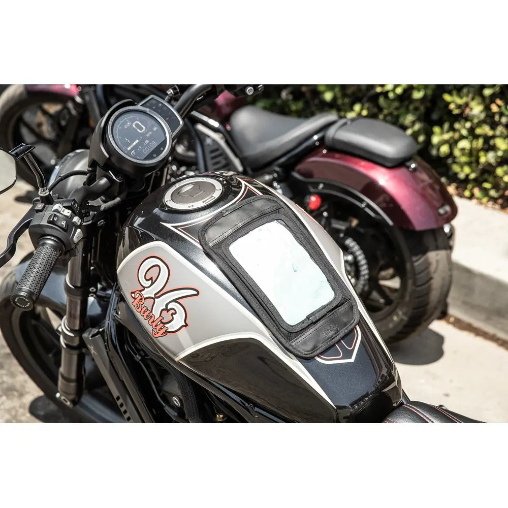The Voyager magnetic phone holder keeps your essentials and phone screen within easy reach while riding. Built with premium materials that age with character, it attaches securely to your tank with a strong magnetic base. The clear screen pocket allows full visibility and access to your device, while its compact design makes it perfect for quick rides or long trips.