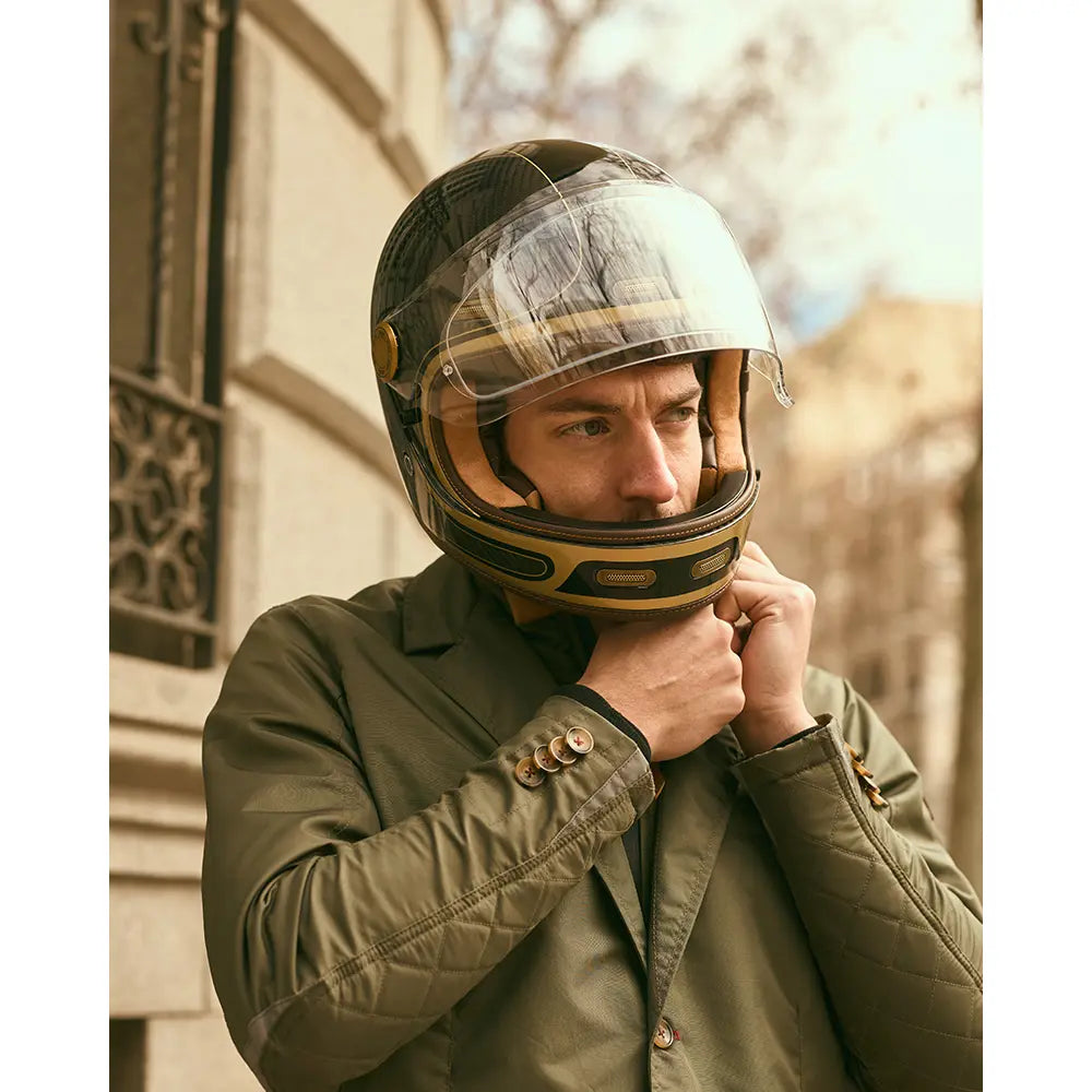 It has been designed for those looking for a classic aesthetic and made of carbon fiber. Leather interior, with easy-to-use double ring fastening system for a perfect fit. Features removable, multi-density and washable interior padding, ventilation inlets and rear fastening for attaching goggles. Injected visor ensures clear vision in all weather conditions. The Roadster II helmet is ECE/UN R.22.06 approved.