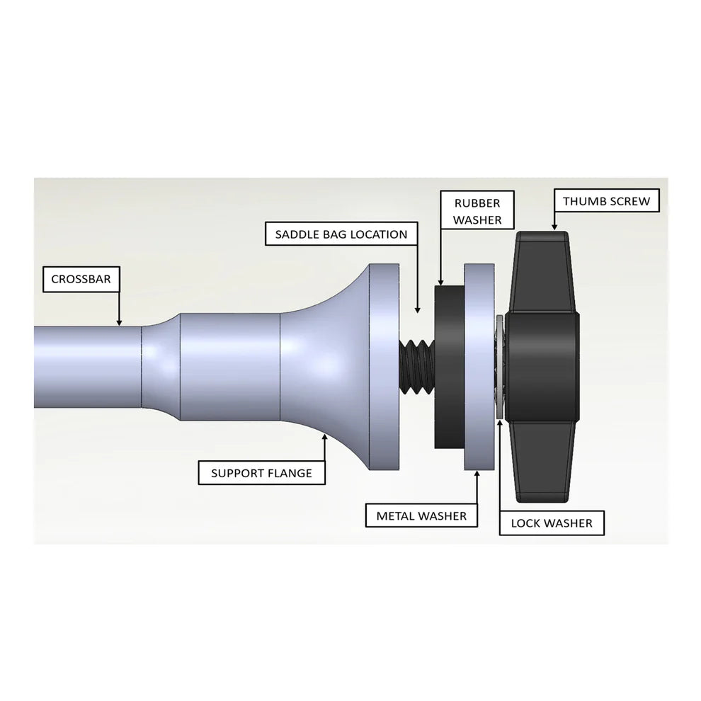 - Includes: 1 crossbar, 2 support flanges, 2 metal washers, 2 rubber washers, 2 lock washers, 2 thumb screws