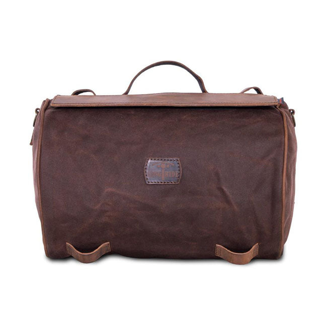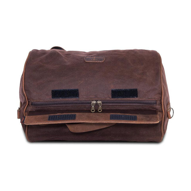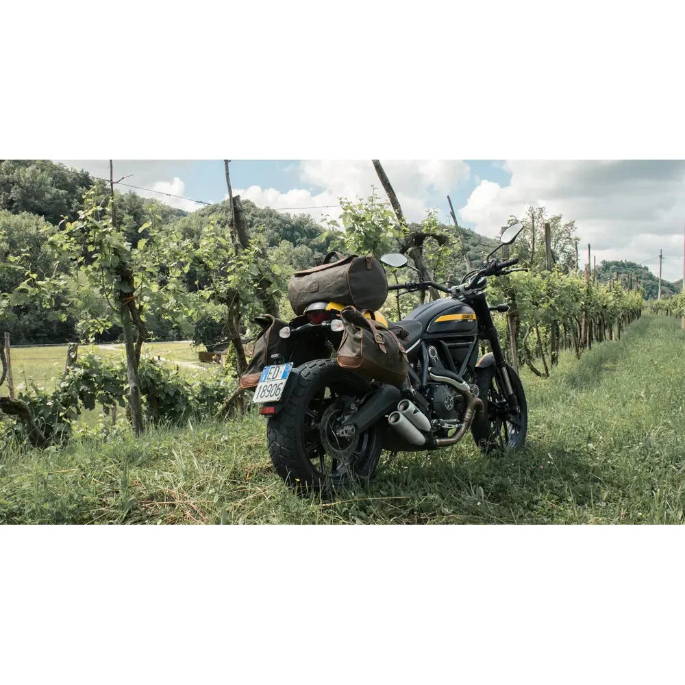 The Small Traveler Motorcycle Duffle Bag is a versatile 17.5L roll bag made from durable waxed cotton canvas with a polyester lining and oiled ranger leather details. Perfect for any trip, it can be strapped to the back of your bike or carried on your shoulder. The bag includes a removable adjustable shoulder strap and two heavy-duty elastic mounting straps for secure attachment.