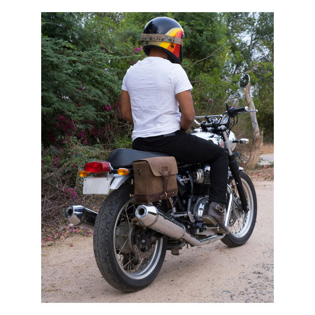 The Trip Machine motorcycle messenger bag takes inspiration from the classic Swiss WWII ammunition bag. Hand made from virtually indestructible 2.5 mm harness-grade heavy-duty leather, this satchel is built to last a lifetime while developing a rich patina with use. Its distinctive weathered finish gives it timeless character, and the universal mount system allows quick on/off installation from your motorcycle. Off the bike, it’s comfortable to carry on your shoulder, with a roomy suede-lined pocket inside to keep your essentials organized.