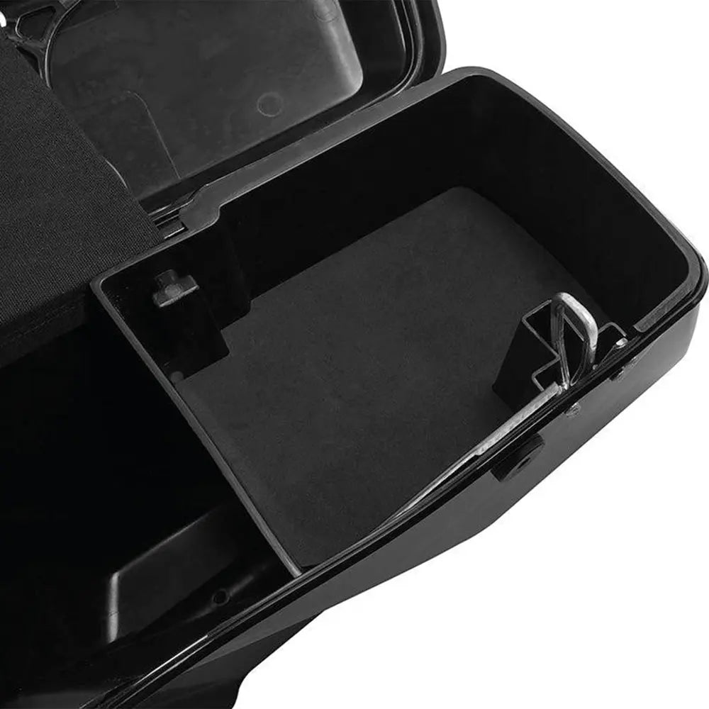 - Designed to fit in the top section of stock-style Harley Touring hard saddlebags